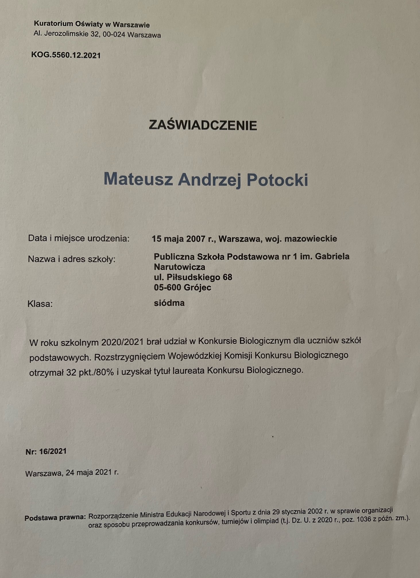 Laureat konkursu przedmiotowego organizowanego przez Mazowieckie Kuratorium Oświaty z biologii, w roku szkolnym 2020/ 2021