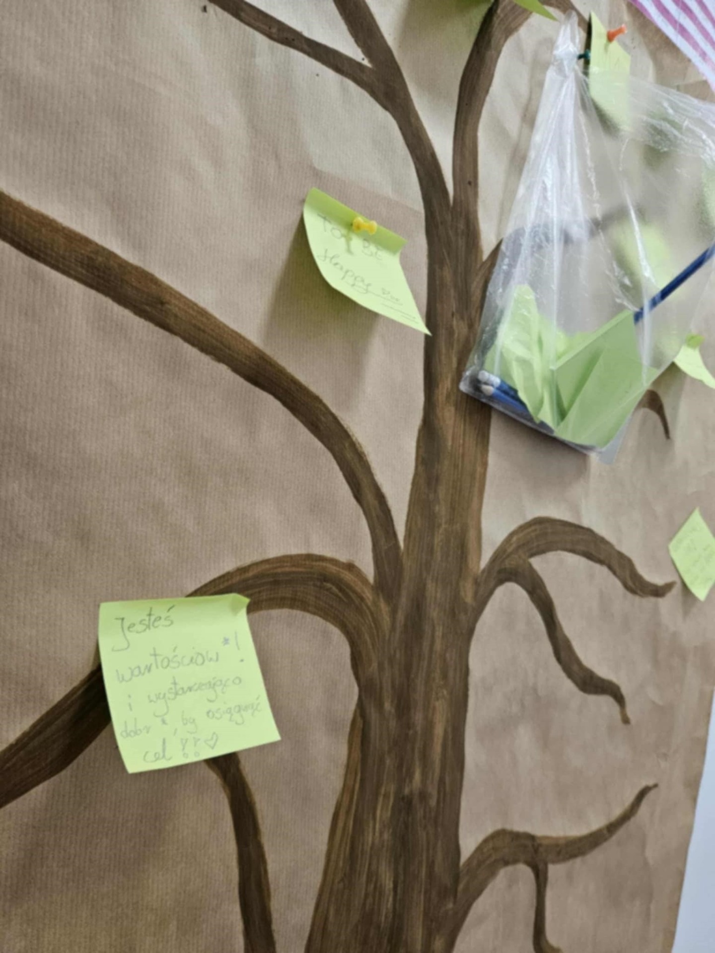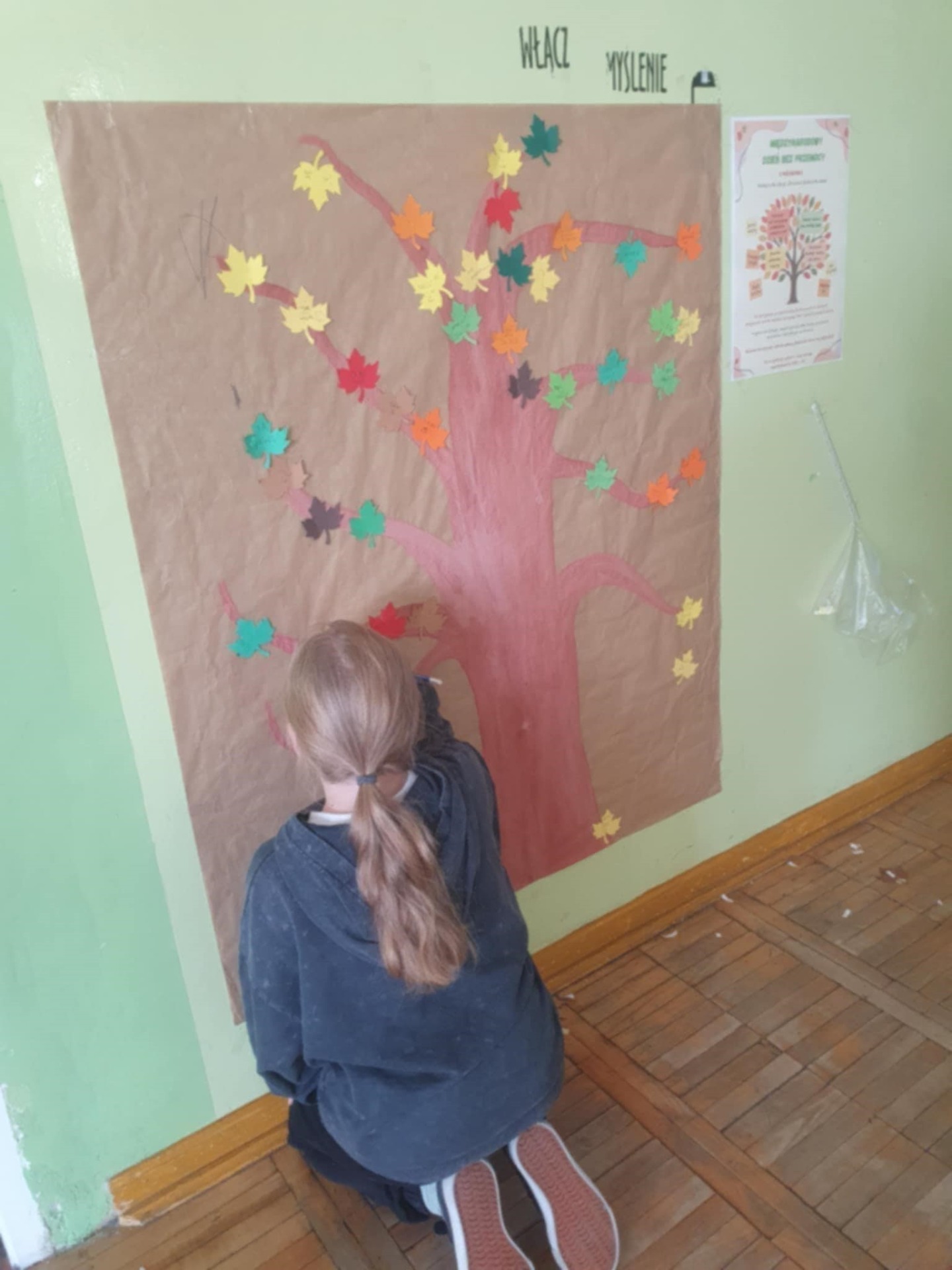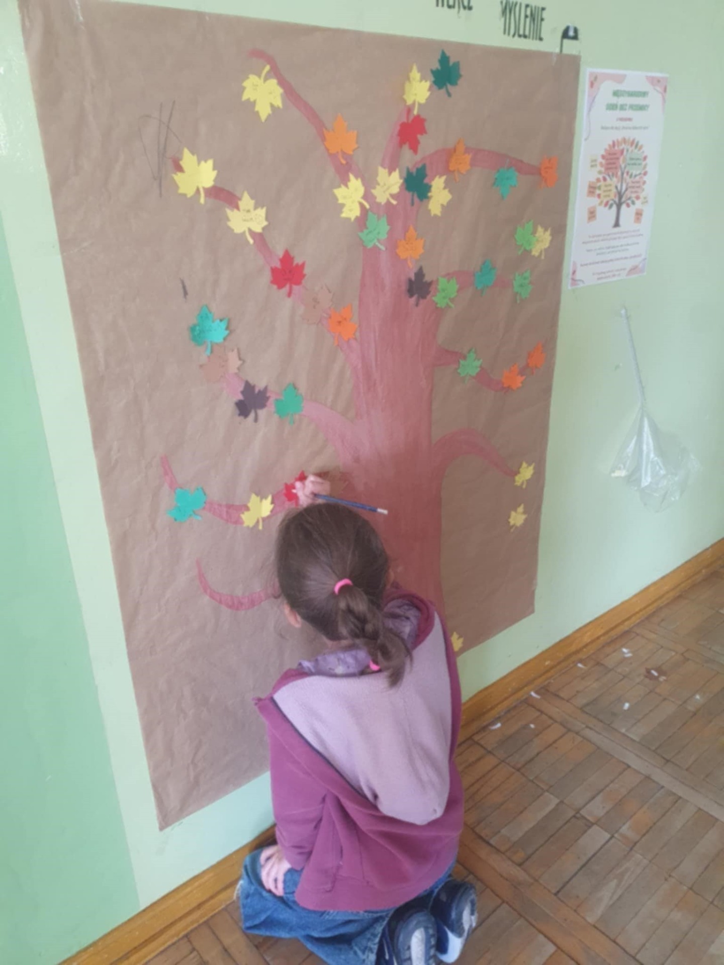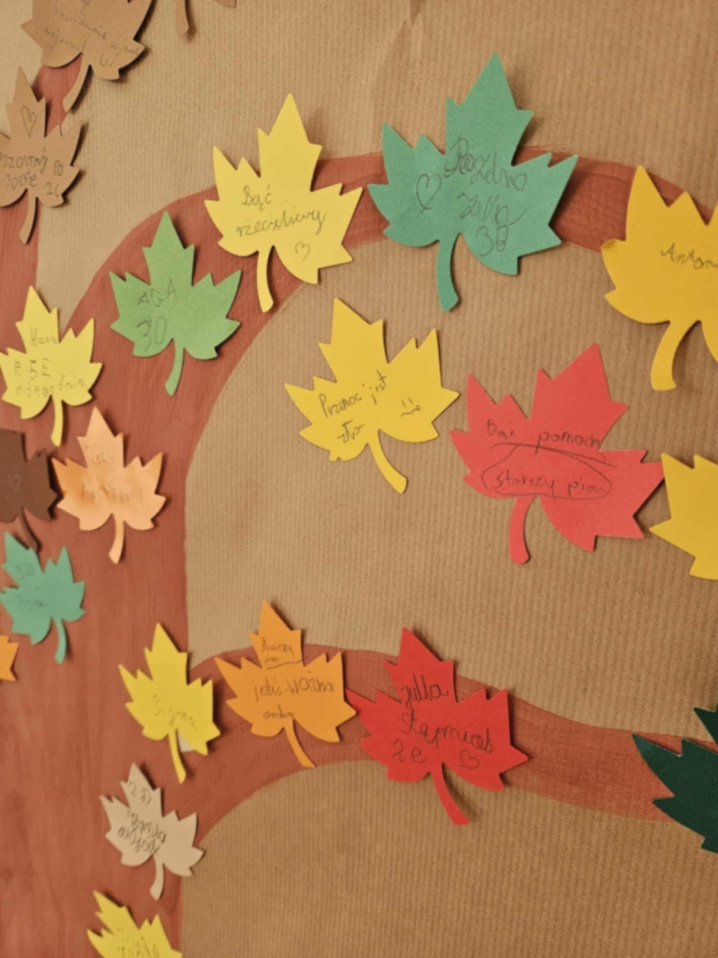 Uczniowie przypinali na drzewku kolorowe liście z miłymi, wspierającymi hasłami,
