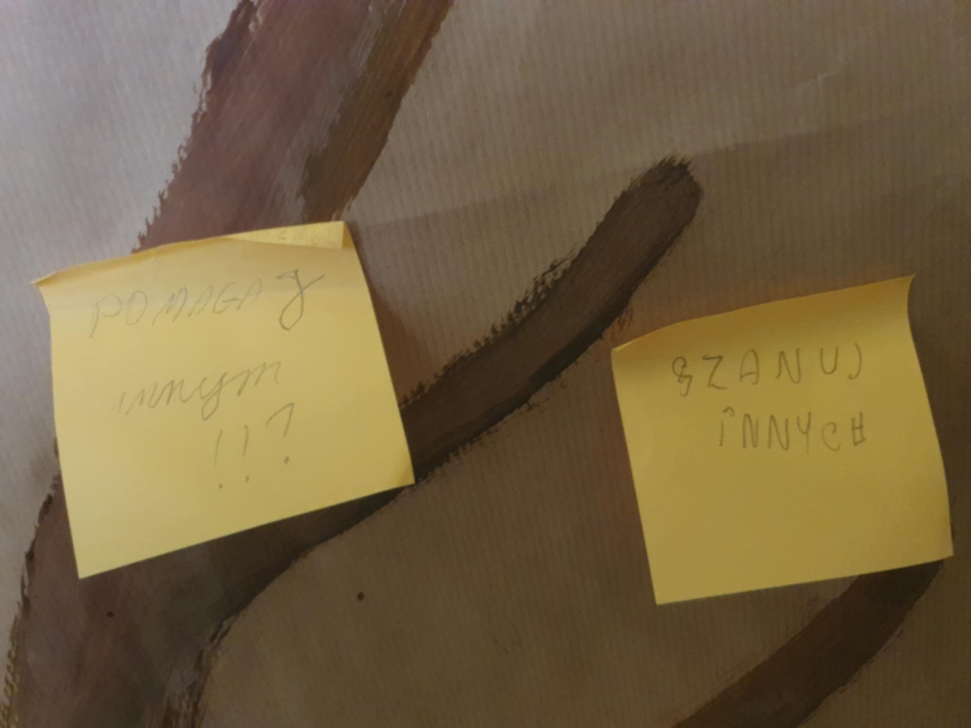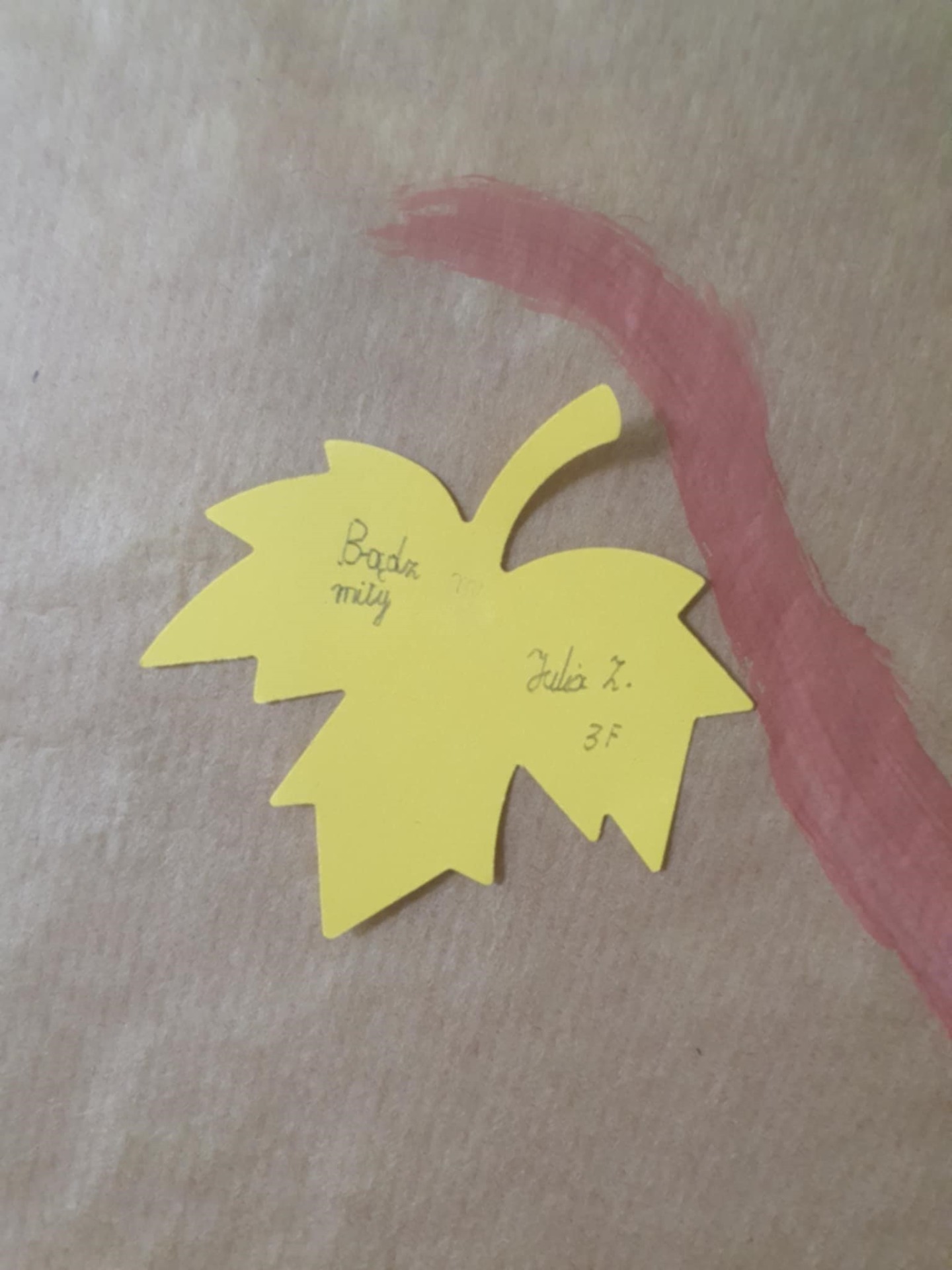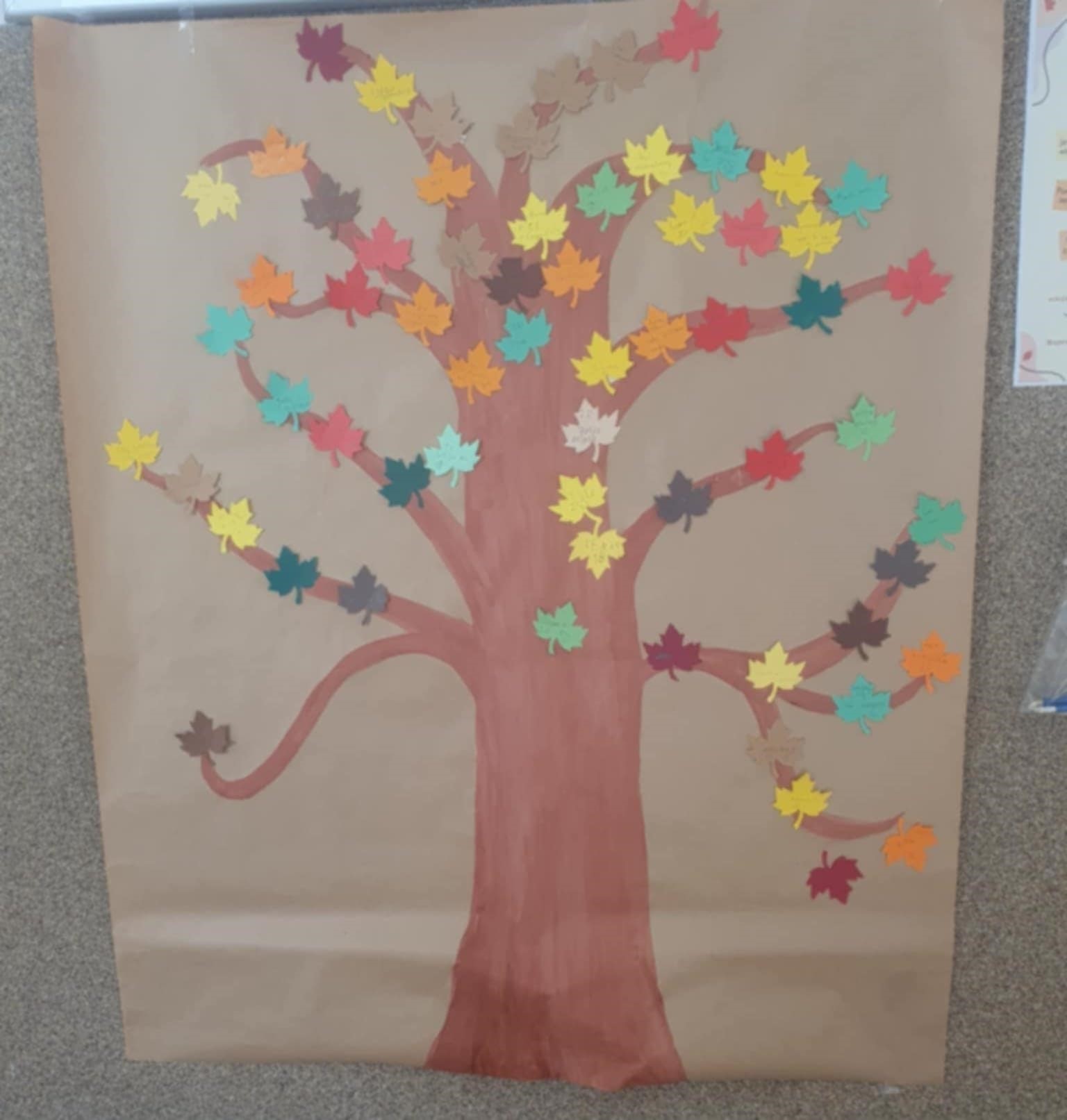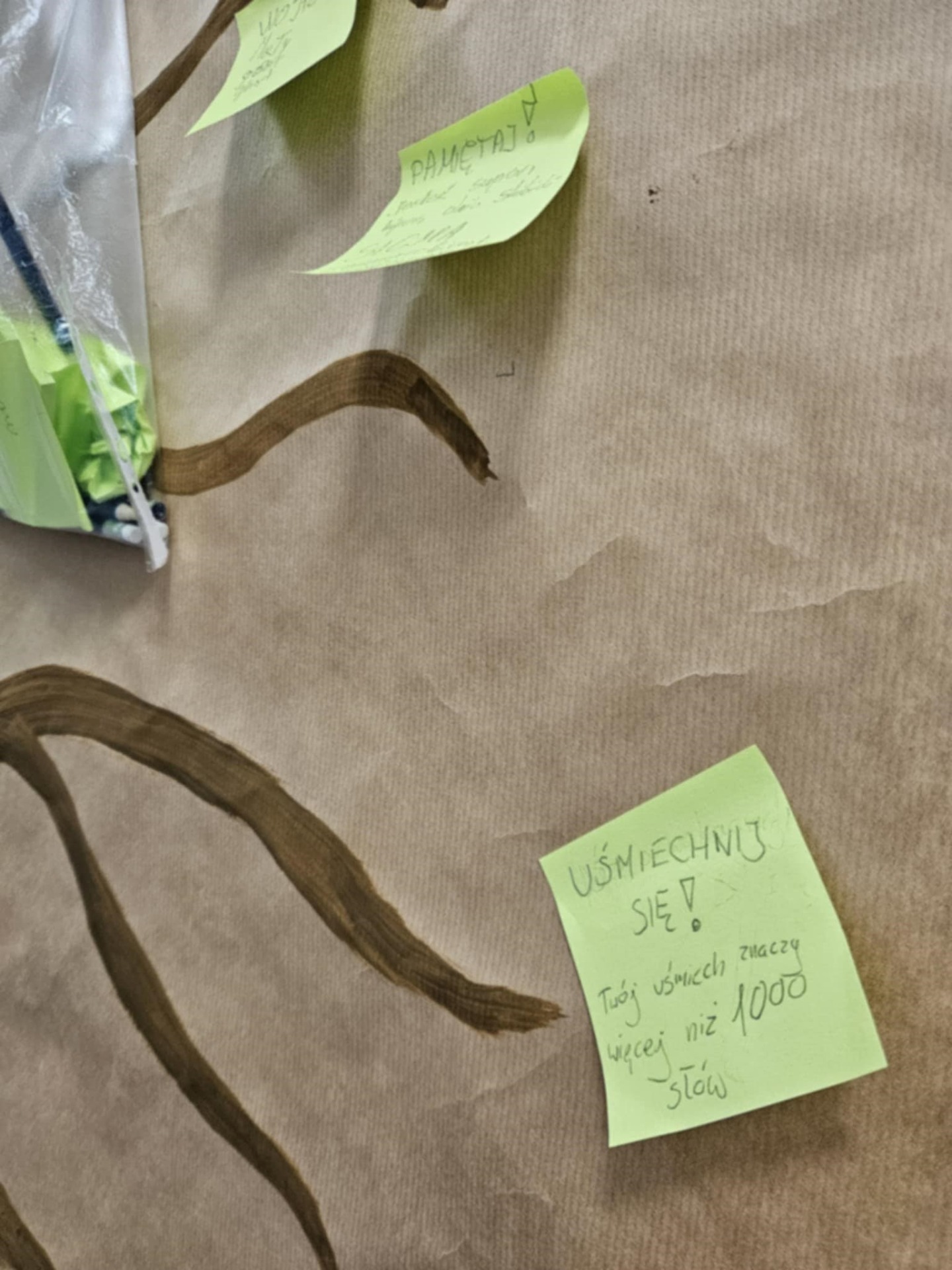 Uczniowie przypinali na drzewku kolorowe liście z miłymi, wspierającymi hasłami,