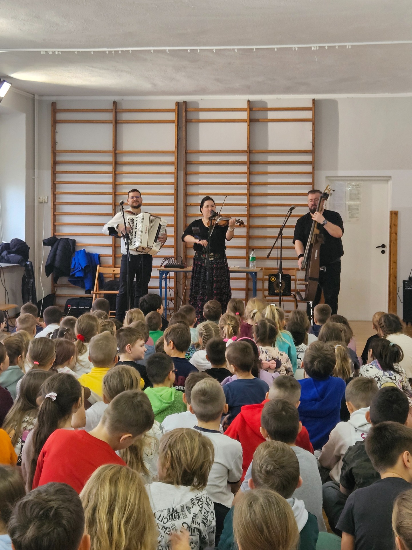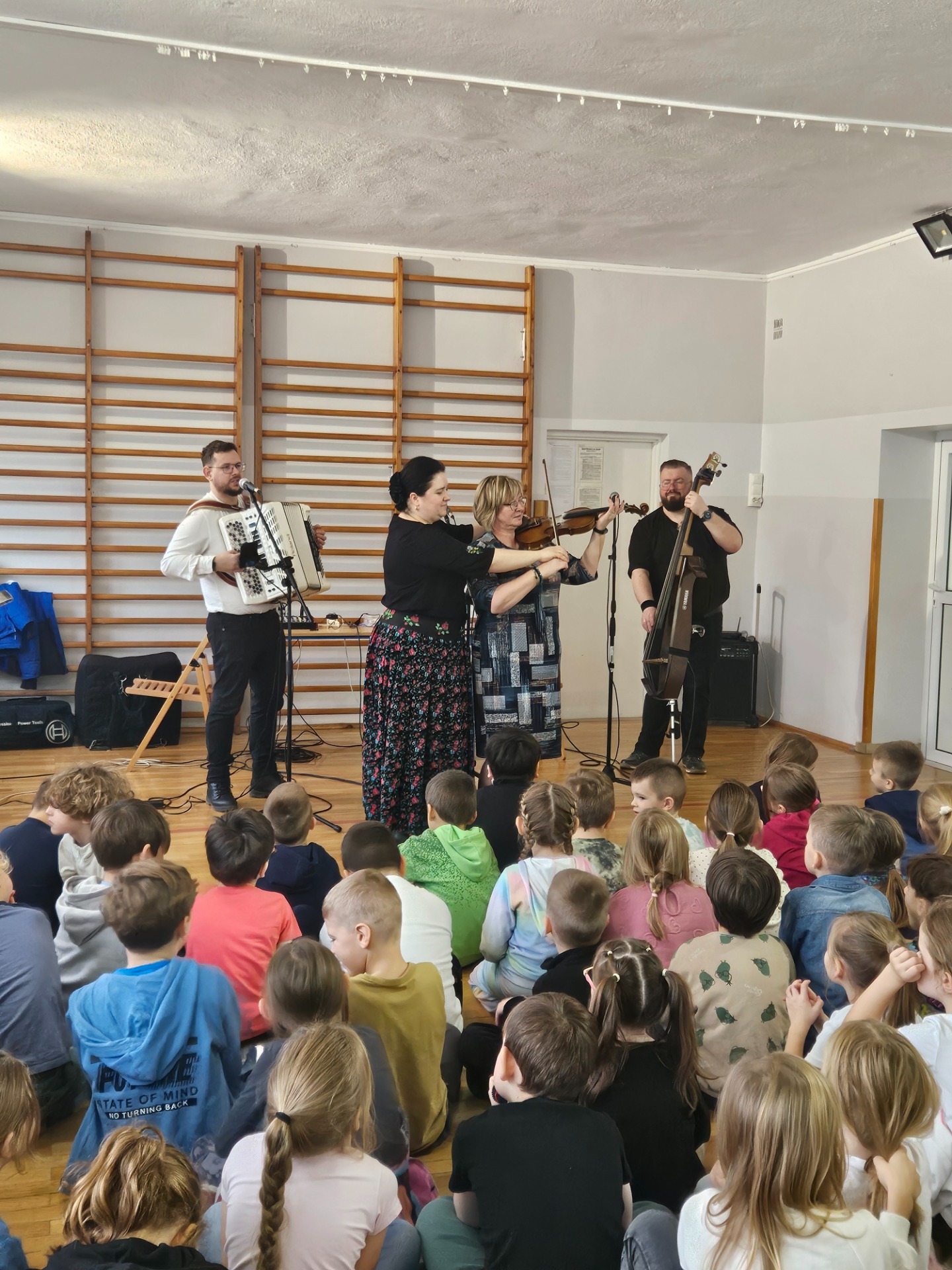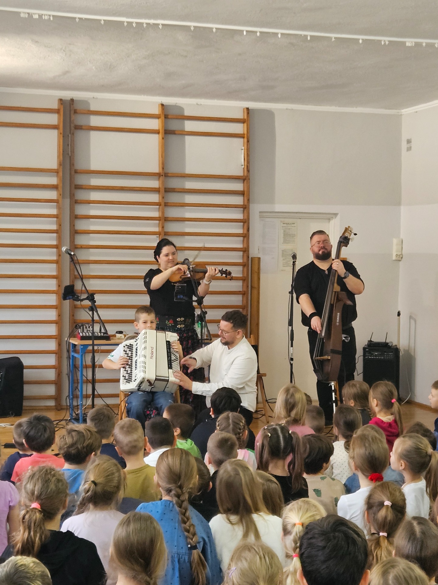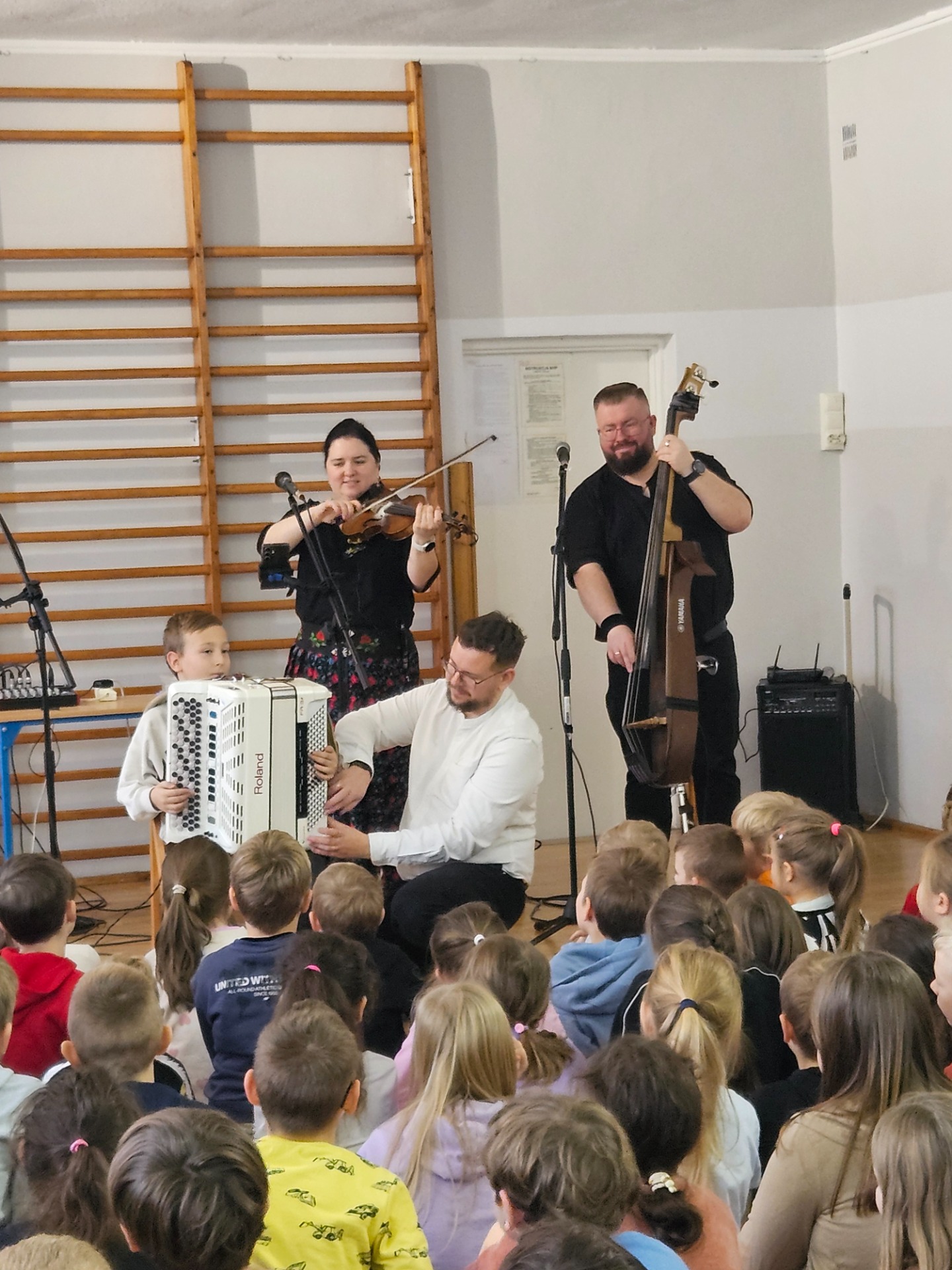 Uczniowie klas 1-3 uczestniczyli dziś w niezwykłym wydarzeniu, jakim był koncert Kapeli Karpati. Za pomocą dźwięków artyści zabrali słuchaczy w muzyczną podróż daleko na południe. Dzięki muzyce i sile wyobraźni dzieci odwiedziły Rumunię, gdzie nauczyły się witać w obcych językach, a na węgierskiej autostradzie, przy akompaniamencie "Czardasza", poznały różnice między skrzypcami i kontrabasem. 🎻 Nie zabrakło dialogu z publicznością, quizów i indywidualnych prób gry na instrumentach. To był wspaniały czas, pełen ekscytacji i niezapomnianych wrażeń.