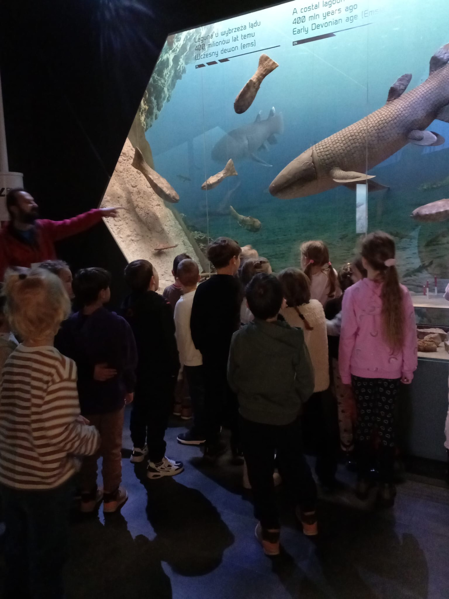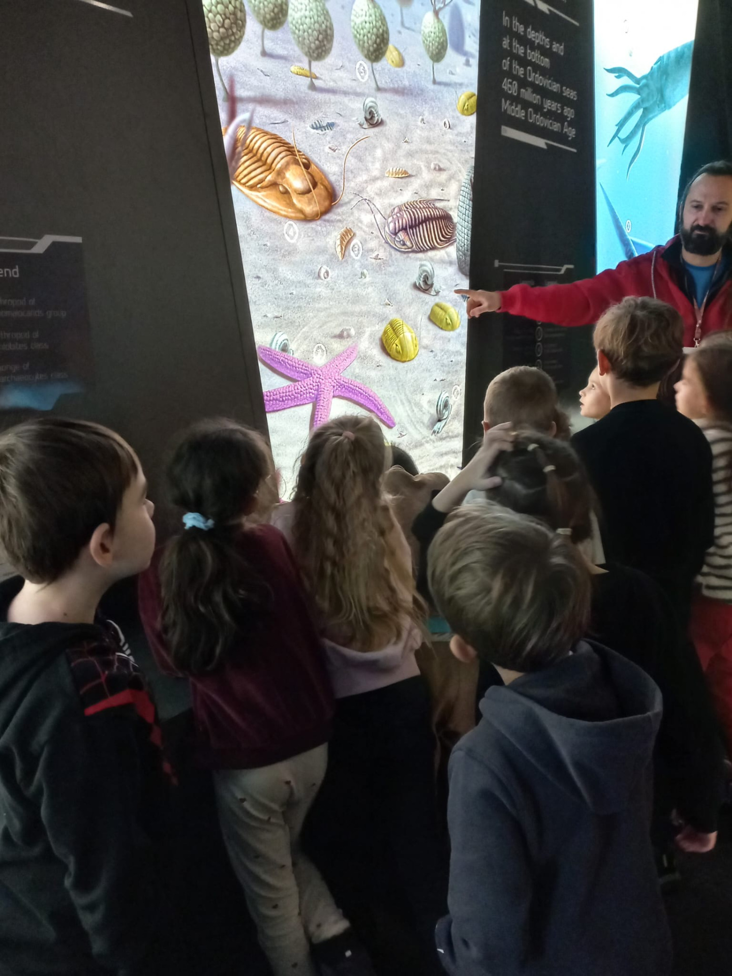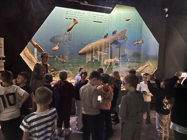 Pierwszym punktem programu było Centrum Geoedukacji, gdzie uczniowie zwiedzili interaktywną wystawę poświęconą historii Ziemi i regionu świętokrzyskiego.