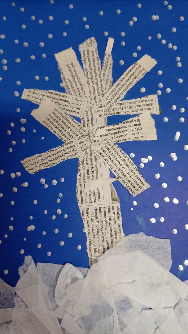 Przy użyciu kawałków gazety, dzieci tworzyły drzewa w zimowej szacie. Technika - wydzieranie pasków z papieru.